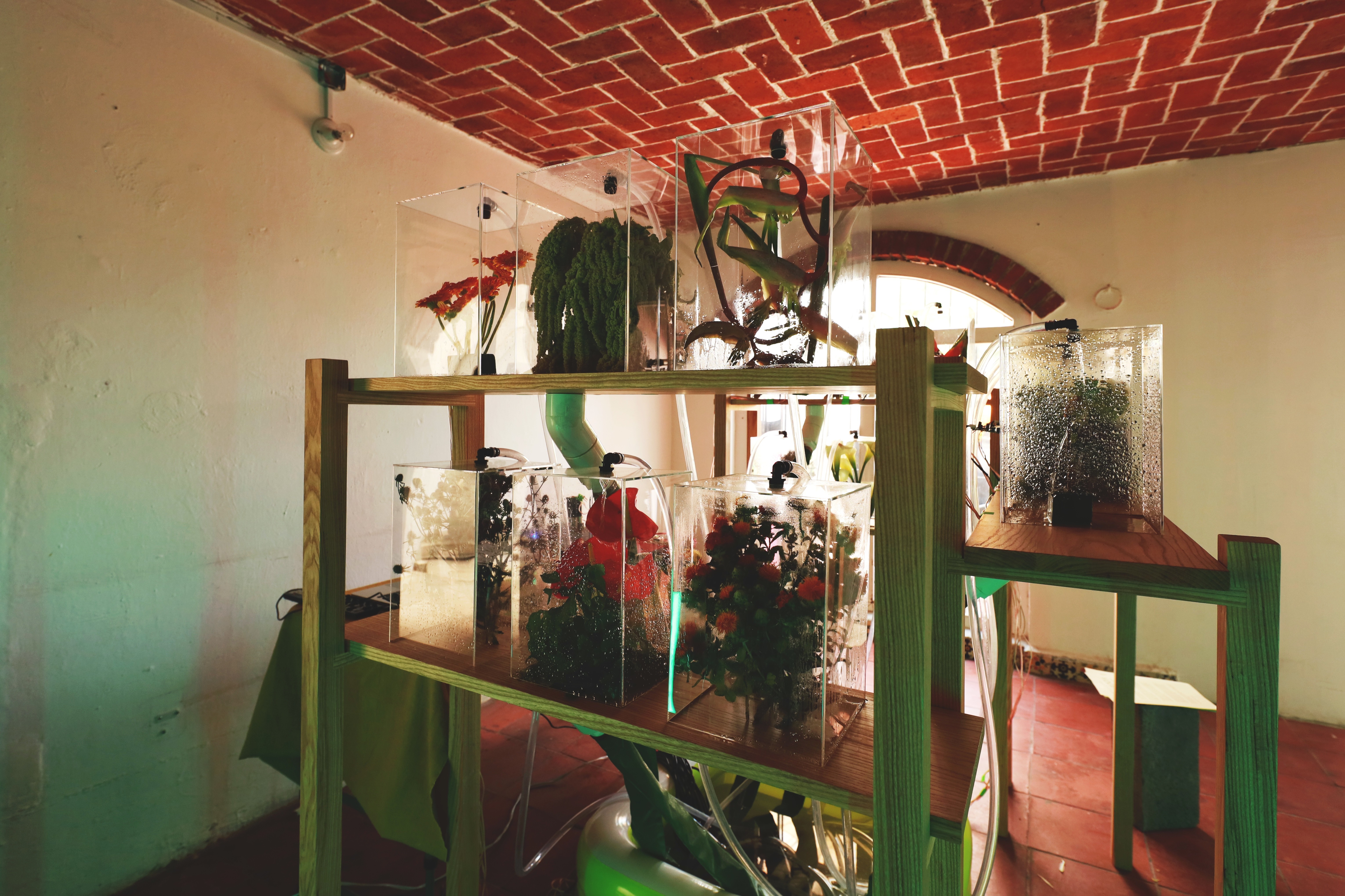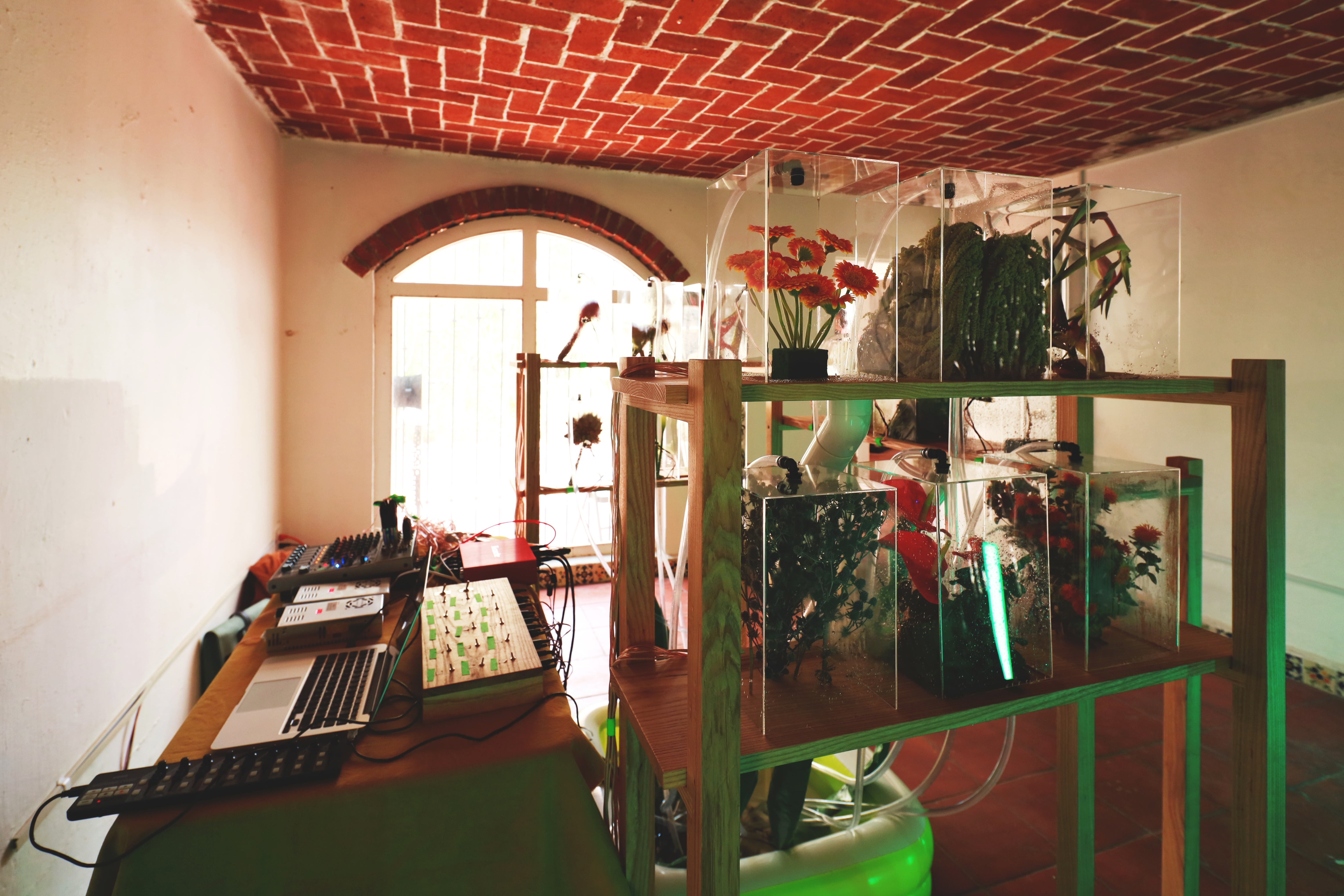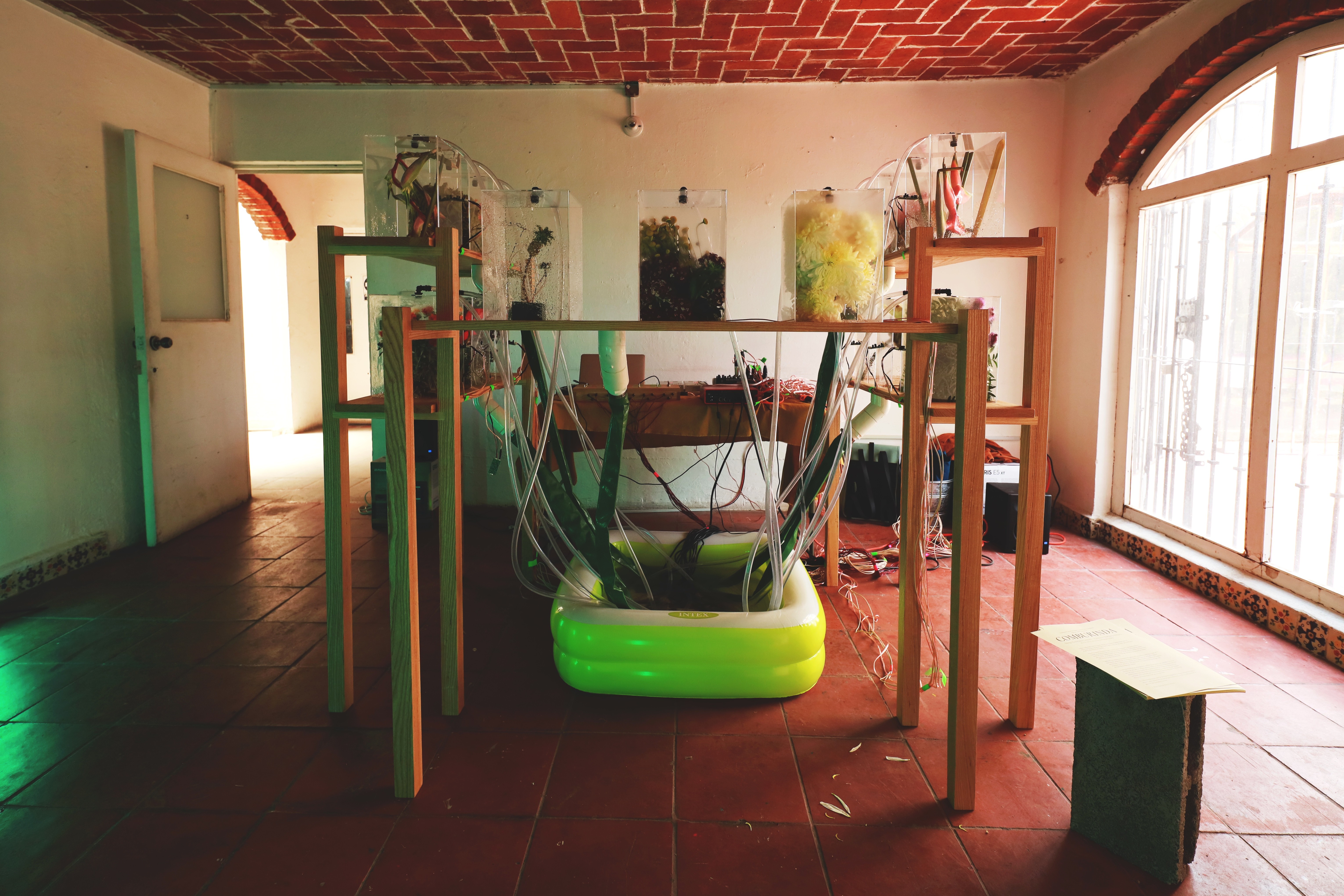 Leamos Comburinda como leer montículos de tierra donde el sonido se hace sitio. La reserva michoacana es el primer lugar desde el que se construye esta pieza pero no el único al que se referirá en su articulación. Para el Encuentro Curatorial: Desde la inercia hacia el desborde, la propuesta artística consiste en una provocación al cruzar las líneas de investigación a partir del instrumento sonoro de Diego González Gómez atravesado por los abordajes de Fabiana Martínez Peláez para producir, en su conjunto, una instalación que emerge de las tensiones articuladas entre las artes visuales y la sonoridad. Comburinda nos remonta al imaginario del gabinete de curiosidades, traído ahora como un diseccionado jardín boscoso. La instalación sonora opera como un catálogo de objetos naturales que se conforma en la caminata por el espacio donde se presenta, así, la pieza se reconstruye en el interior de cada contenedor y en la posibilidad acústica que cada elemento floral depositado permite. La selección floral indaga principalmente en flores de ornamento que responden a criterios específicos del mercado de las flores. Martínez Peláez se aproxima a la estetización de este mercado desde el cultivo guiado por su potencia visual, de la historia del mismo y sus modificaciones tanto sistemáticas como económicas. La muestra floral que compone Comburinda, está constituida por una selección de especies cultivadas en el Estado de México y de mayor exportación por su esteticidad. En ambos artistas encontramos un abordaje del desgaste de los elementos naturales sobre sí mismos y sobre otros elementos con los que coexisten cuya raíz de la modificación se ha generado por la actividad humana.