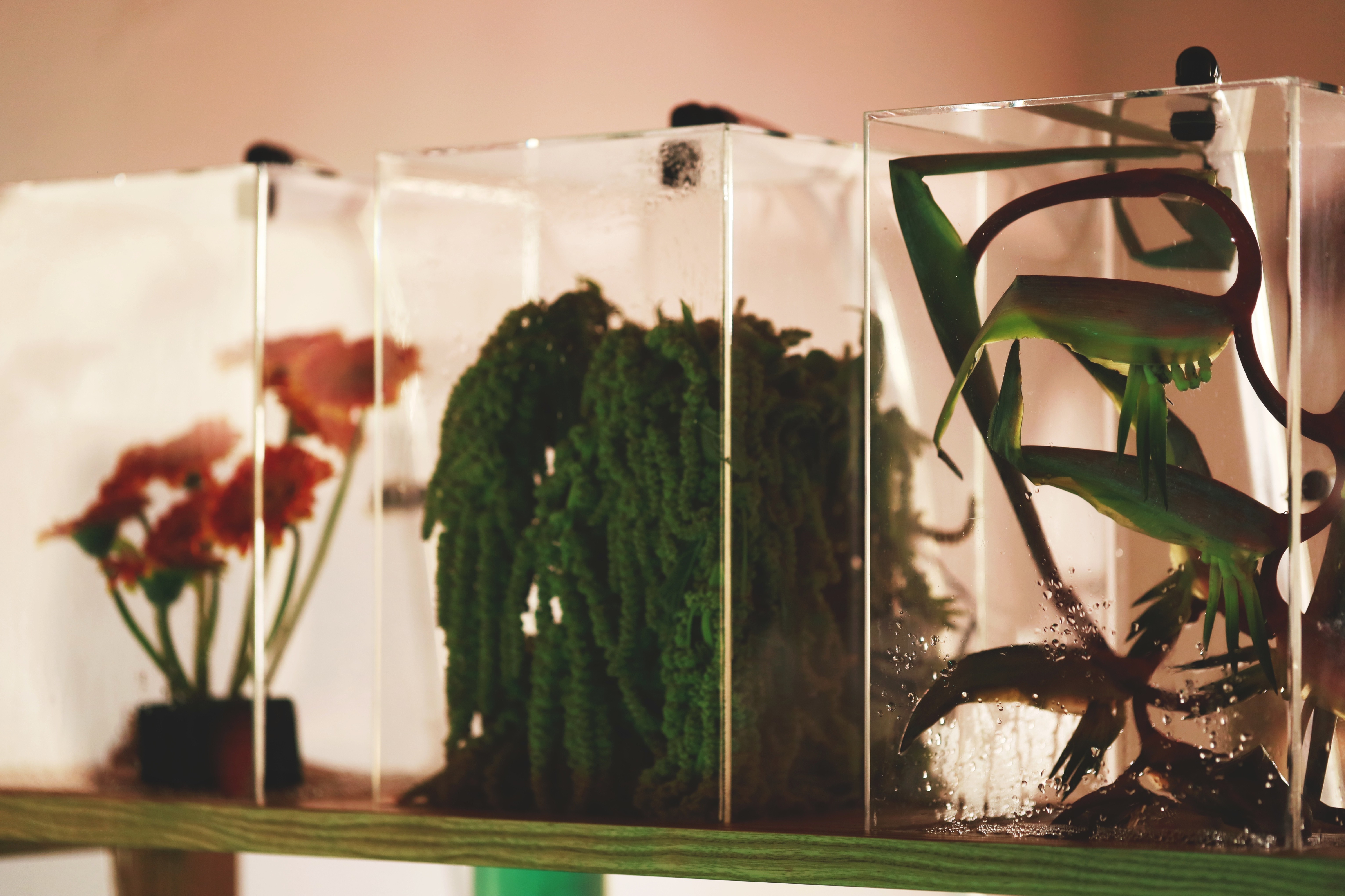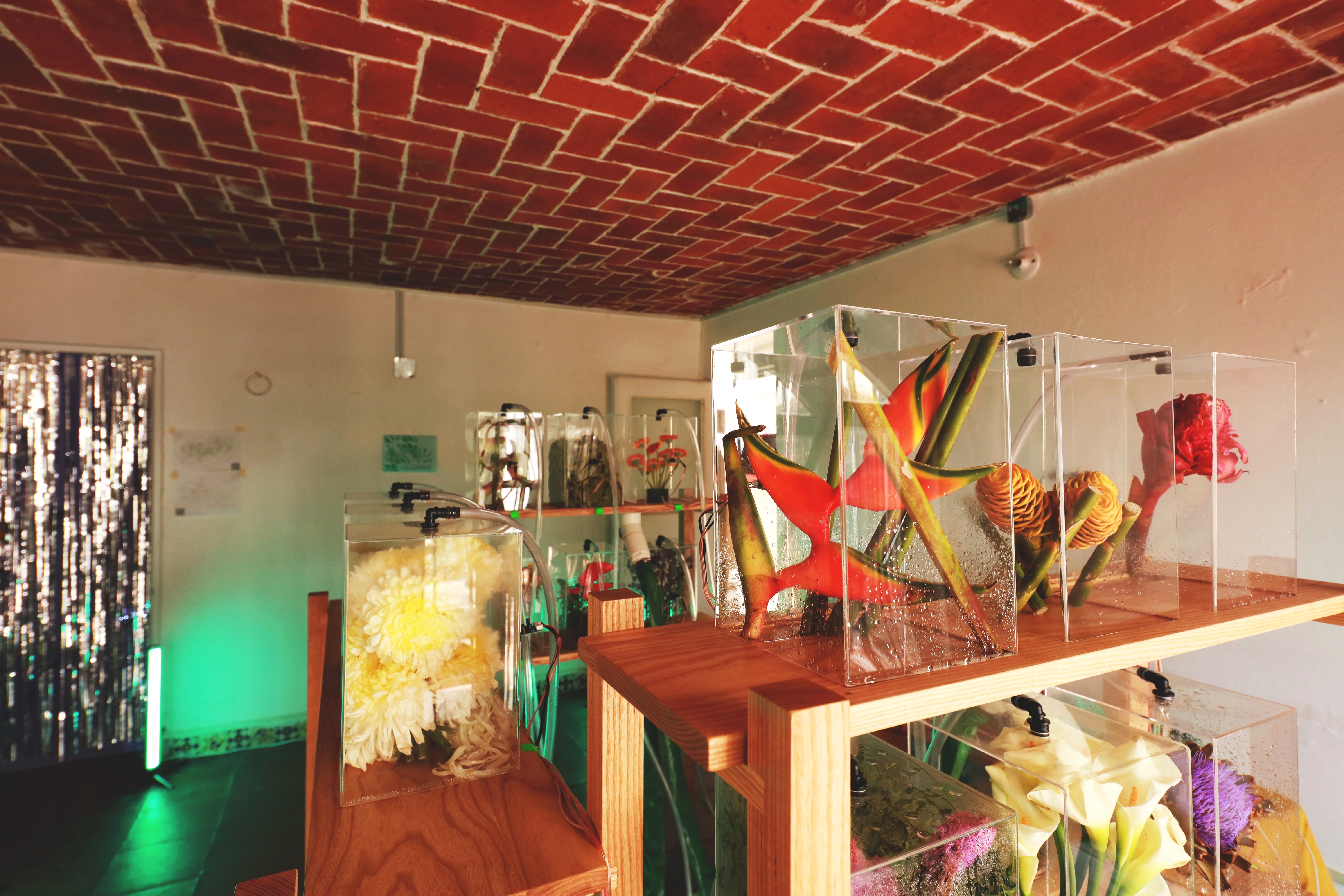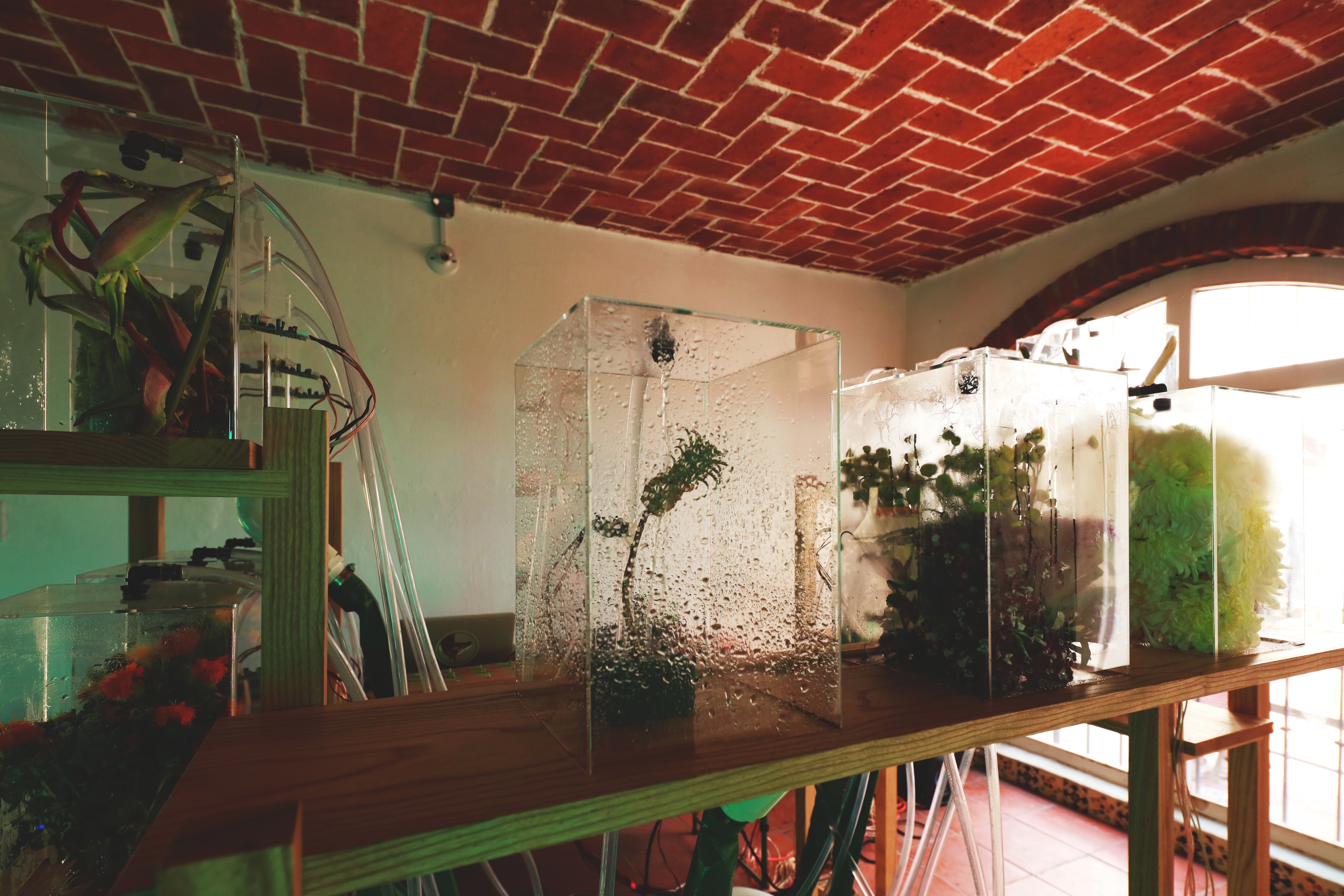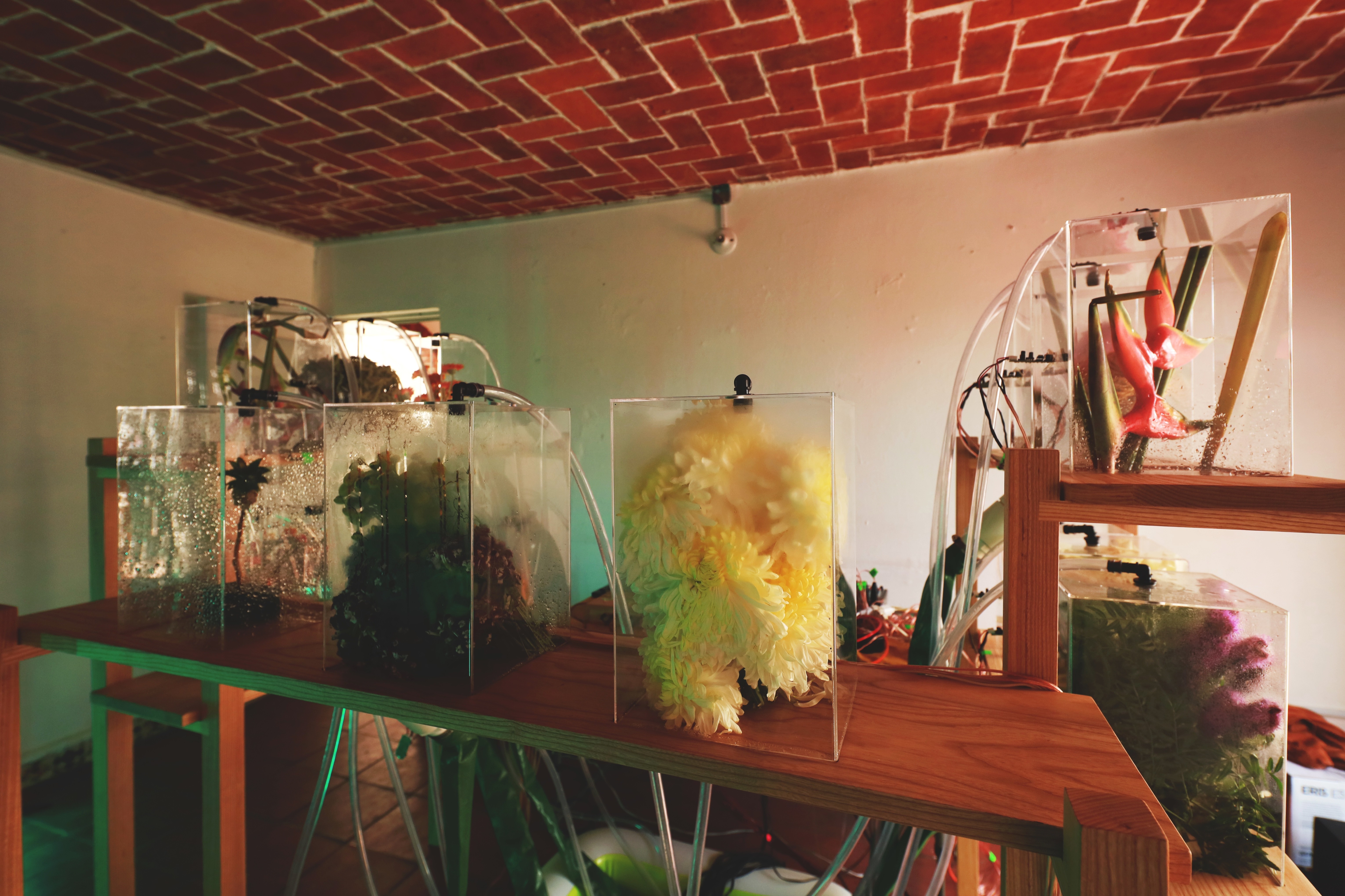 Leamos Comburinda como leer montículos de tierra donde el sonido se hace sitio. La reserva michoacana es el primer lugar desde el que se construye esta pieza pero no el único al que se referirá en su articulación. Para el Encuentro Curatorial: Desde la inercia hacia el desborde, la propuesta artística consiste en una provocación al cruzar las líneas de investigación a partir del instrumento sonoro de Diego González Gómez atravesado por los abordajes de Fabiana Martínez Peláez para producir, en su conjunto, una instalación que emerge de las tensiones articuladas entre las artes visuales y la sonoridad. Comburinda nos remonta al imaginario del gabinete de curiosidades, traído ahora como un diseccionado jardín boscoso. La instalación sonora opera como un catálogo de objetos naturales que se conforma en la caminata por el espacio donde se presenta, así, la pieza se reconstruye en el interior de cada contenedor y en la posibilidad acústica que cada elemento floral depositado permite. La selección floral indaga principalmente en flores de ornamento que responden a criterios específicos del mercado de las flores. Martínez Peláez se aproxima a la estetización de este mercado desde el cultivo guiado por su potencia visual, de la historia del mismo y sus modificaciones tanto sistemáticas como económicas. La muestra floral que compone Comburinda, está constituida por una selección de especies cultivadas en el Estado de México y de mayor exportación por su esteticidad. En ambos artistas encontramos un abordaje del desgaste de los elementos naturales sobre sí mismos y sobre otros elementos con los que coexisten cuya raíz de la modificación se ha generado por la actividad humana.