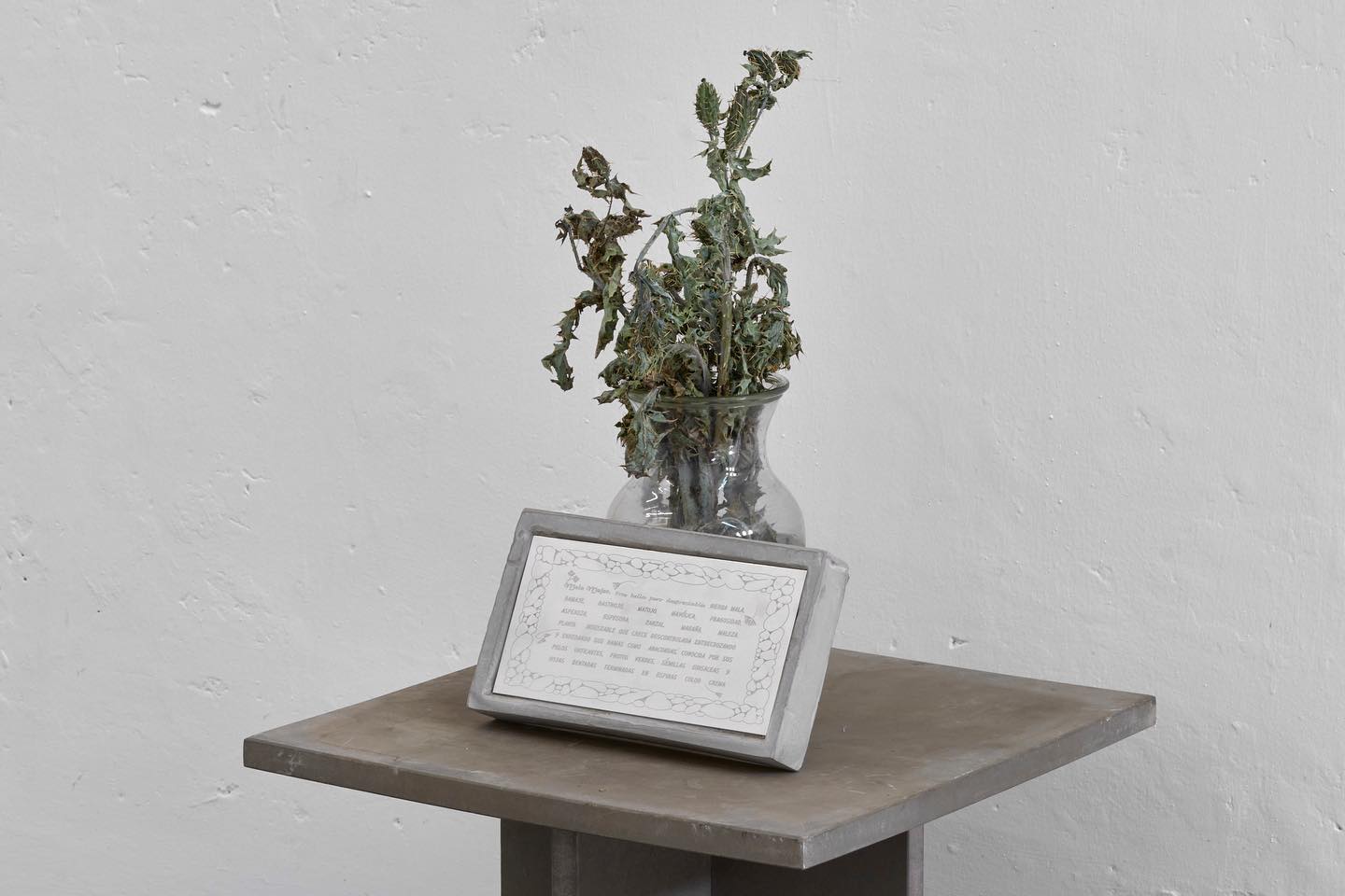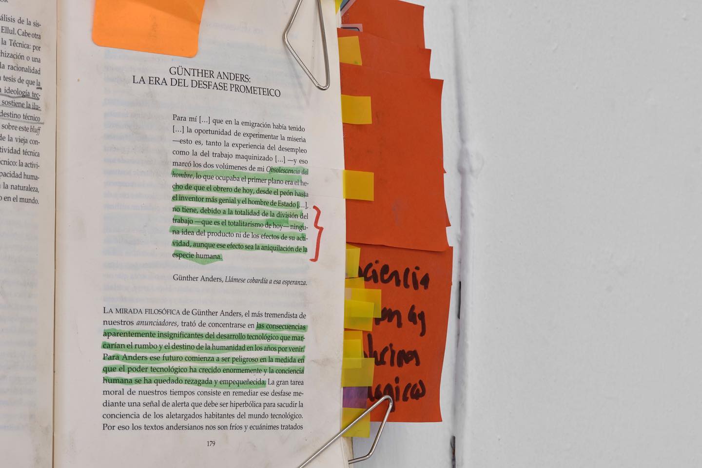 (...) lo que ocupaba el primer plano era el hecho de que el obrero de hoy, desde el peón hasta el inventor más genial y el hombre de Estado (...), no tiene debido a la totalidad de la división del trabajo -que es el totalitarismo de hoy- ninguna idea del producto ni de los efectos de su actividad, aunque ese efecto sea la aniquilación de la especie humana. Günter Anders, llámese cobardía a esa esperanza. La extrema división del trabajo reduce a cada uno a concentrarse en pequeños segmentos de los procesos de producción, perdiendo de vista la finalidad del sistema en su totalidad y sus consecuencias en el mundo, dando como resultado una discrepancia entre lo que podemos producir con nuestro poder tecnológico y lo que somos capaces de comprender e imaginar. Sin embargo, las prácticas artísticas son de las pocas actividades contemporáneas que se resisten a esta hiperespecialización (al menos en algunos de sus mecanismos de producción), permitiéndonos el análisis de acontecimientos singulares del presente, que pasan a veces inadvertidos, describiéndolos a través de su opacidad y de su ambigüedad. Los artistas aquí reunidos no tratan de exhibir el conocimiento, sino la relación sensible que uno tiene con él tomando una posición en relación con el concepto y la representación del mismo. Muchos de los objetos de estudio que aquí vemos ya no son manipulables ni visibles en una distancia fenomenológica. Sin embargo, haciendo uso de la similitud, la metáfora, la resolución del concepto en una figura, nos encontramos con cuestionamientos sobre la forma en que la ciencia o la cultura contemporánea ven la realidad.